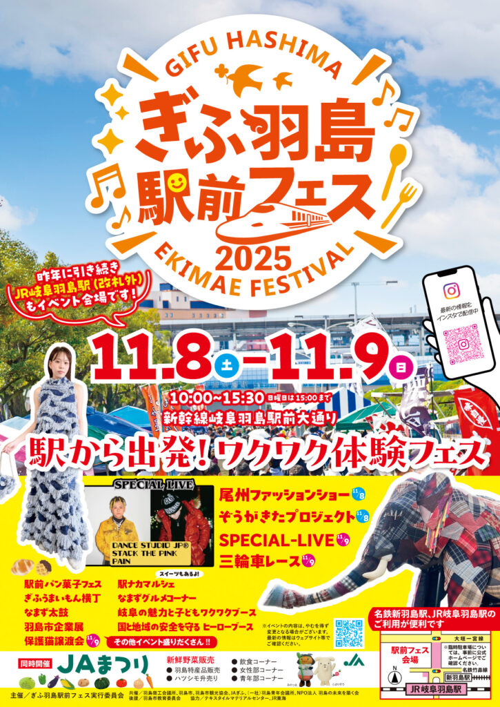 ぎふ羽島駅前フェス2025【ポスター完成!最新情報】 2025/09/05 ポスターが完成しました!ぜひご覧ください。去年に引き続き、JR岐阜羽島駅構内(改札外)でもイベントを予定しています。みなさんのご参加をお待ちしています。公式ホームページやインスタグラムで、イベント情報や駐車場のご案内などをどんどんアップしていきますので、こちらもお楽しみに!